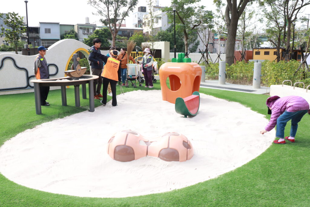 馮兆麟說明,最吸睛的亮點為蜂巢主題遊戲塔,靈感源自蜜蜂飛行路徑,設計富有挑戰性的滑梯與攀爬設施,鼓勵孩童探索冒險;共樂地景沙坑區提供西瓜轉盤、沙坑及益智遊戲牆,促進孩童感官發展與社交互動。