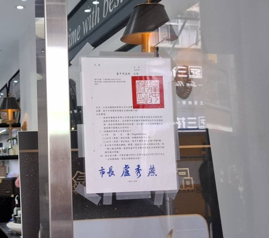 位於台中市豐原區中正路149號之怡豫股份有限公司(店招:Elegant&Unique,下稱怡豫公司),因近來消費申訴案件數量顯著增加,且屢次違反《消費者保護法》第18條及台中市《消費者保護自治條例》第5條規定,經衛生局裁罰後仍未改善。台中市政府法制局長李善植表示,台中市113年修正公布台中市消費者保護自治條例,首創政府機關可前往業者營業場址張貼消費警訊告示之機制。新法上路後,市府審酌怡豫公司違規情節及消費申訴案件顯著增加的狀況,由市府消保官及衛生局等單位於其營業場所張貼公告,業者自114年11月28日至同年12月27日,不得撕毀、移置、遮蔽或有其他致一般人無法辨識該公告之行為;期能提醒消費者慎選店家、謹慎消費。
