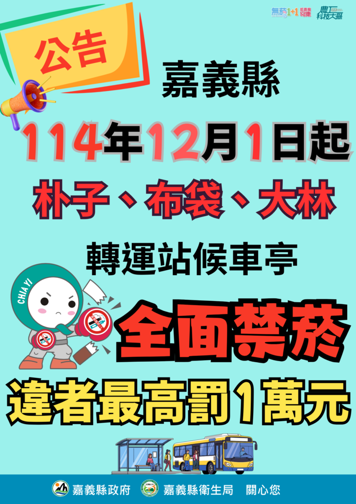 為提升縣民健康並遠離菸害,嘉義縣自12月1日起擴大公告無菸場所,新增布袋、朴子及大林轉運站3處候車亭全面禁菸。
