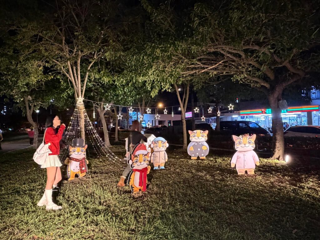 另外,「貓裏喵雪國村」係由裝扮6款不同造型的「貓裏喵雪裝」,打造大小朋友都喜愛的童話小鎮,從經典迎賓款到趣味的奶茶雪暖款,成功地融合了地方特色與節慶趣味,洋溢溫馨歡樂的親子共遊氛圍。而「雪映之丘」則以「光映著雪,雪照著心」為主軸,設置多組互動腳踏板裝置;民眾在踩踏之間,感受雪丘的亮度變化,最終形成光帶交織的壯麗畫面;在整體光環境設計上,巧妙在中央走廊 16 株林木 以暖白光布置樹燈,搭配細條狀流星燈增添層次感。
