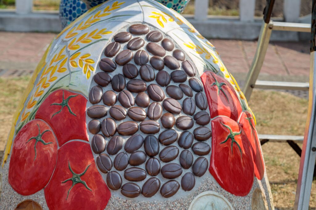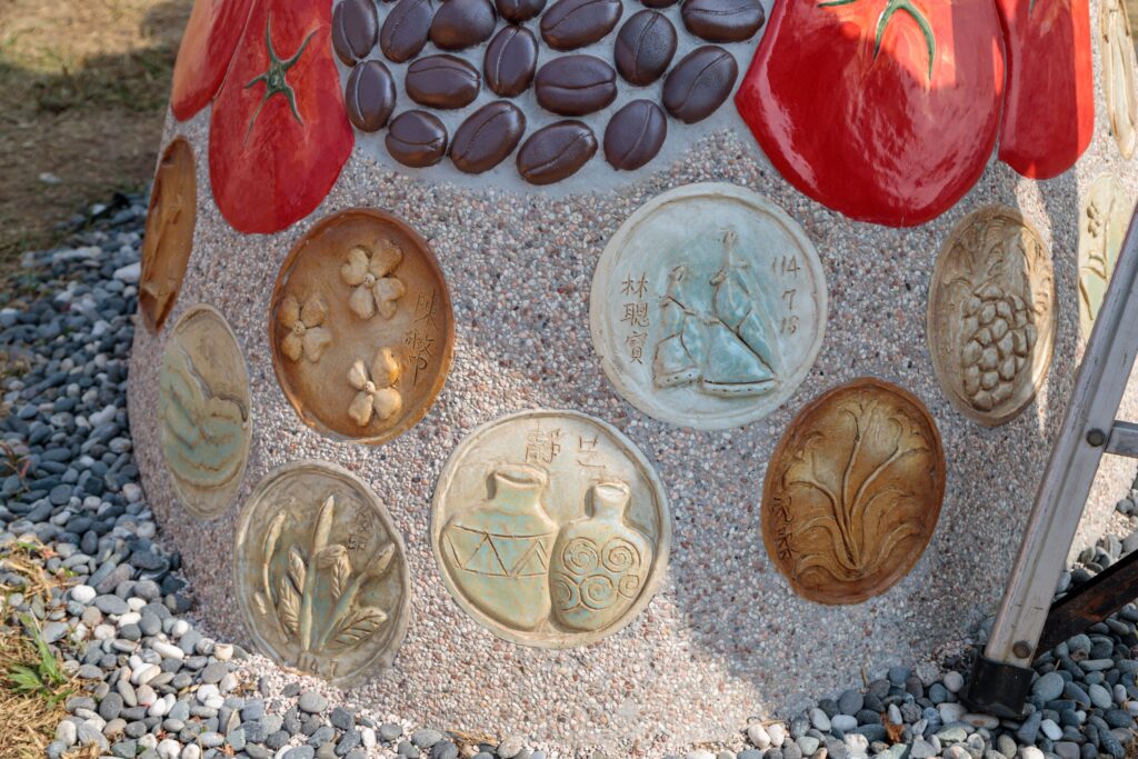 李俊蘭說,以往社區及學校都做實用器物或陶板牆,今年首次做大型陶藝雕塑立體作品,內含水資源概念、嘉義縣大阿里山的形象及農特產蔬菜水果,這次也特別利用水庫清淤當作材料,環保再應用,變成栩栩如生的咖啡豆,為藝術雕塑向前跨進一步。