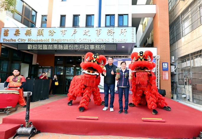 縣長鍾東錦、縣府民政處長巫恒昭、交工處長古明弘、頭份市長羅雪珠、代表會主席溫宜靜、行政院中部聯合服務中心副執行長李貴富、立委邱鎮軍秘書、副議長張淑芬、議會祕書長范陽添及地區議員,上午共同為新建辦公廳舍落成啟用剪綵,地方帶來舞蹈表演及祥獅獻瑞熱鬧慶祝,各里長及代表和鄉親都到場觀禮,一起見證頭份戶政邁向新的里程。