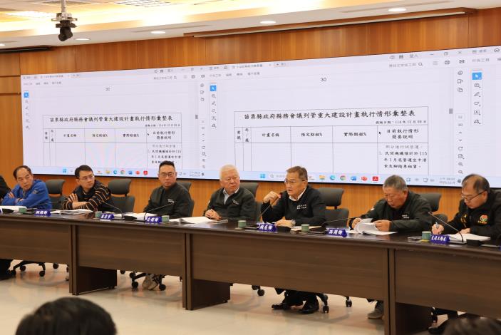 會中,各局處首長說明重大建設計畫執行進度及情形,主管單位針對高樓施工安全及防災能力、缺工問題、光電球場建置進度延宕問題說明辦理情形及進度;縣長鍾東錦另關心明德水庫水位下降影響業者及觀光問題,文觀局長林彥甫說明,海棠島遊憩區當初與農水署簽訂契約有明訂水位下降不收場租,遊船方面則有配套措施,讓遊客能於船上欣賞舞蹈表演。