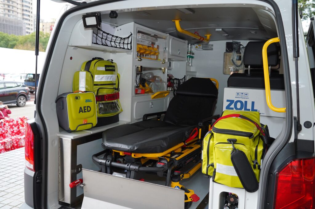 此次捐贈的救護車配備多項先進器材,包括電動擔架床、攜帶式自動電擊器、履帶式搬運椅、自動給氧器、小兒擔架床固定裝置組,以及成人與幼兒用骨盆固定器。電動擔架床能有效減輕救護人員在搬運病患時的腰部負荷,提升作業安全;攜帶式自動電擊器則是處理OHCA患者不可或缺的關鍵急救裝備。