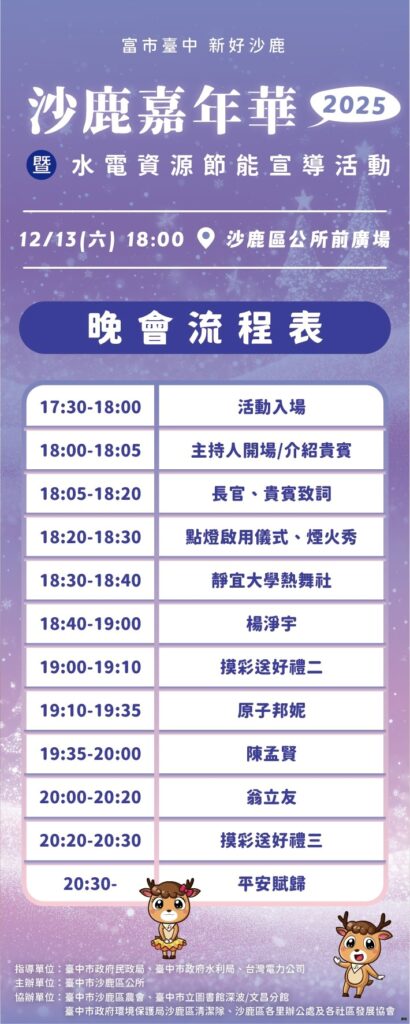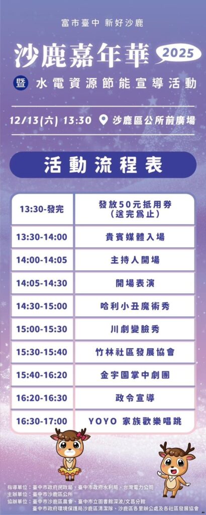 吳局長指出,12月13日沙鹿嘉年華將盛大開幕,沙鹿區公所前廣場推出親子童樂會及音樂晚會,邀請深受小朋友喜愛的 YOYO 家族姐姐、金曲歌王翁立友、人氣樂團原子邦妮、療癒女聲楊淨宇及全球巨星陳孟賢等接力演出,還有3分鐘璀璨煙火秀照亮海線夜空,活動內容豐富多元、精彩可期,歡迎民眾齊聚沙鹿,共同享受這場年度冬季嘉年華盛典。