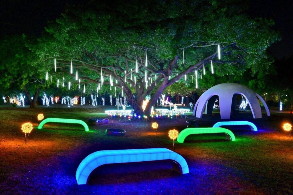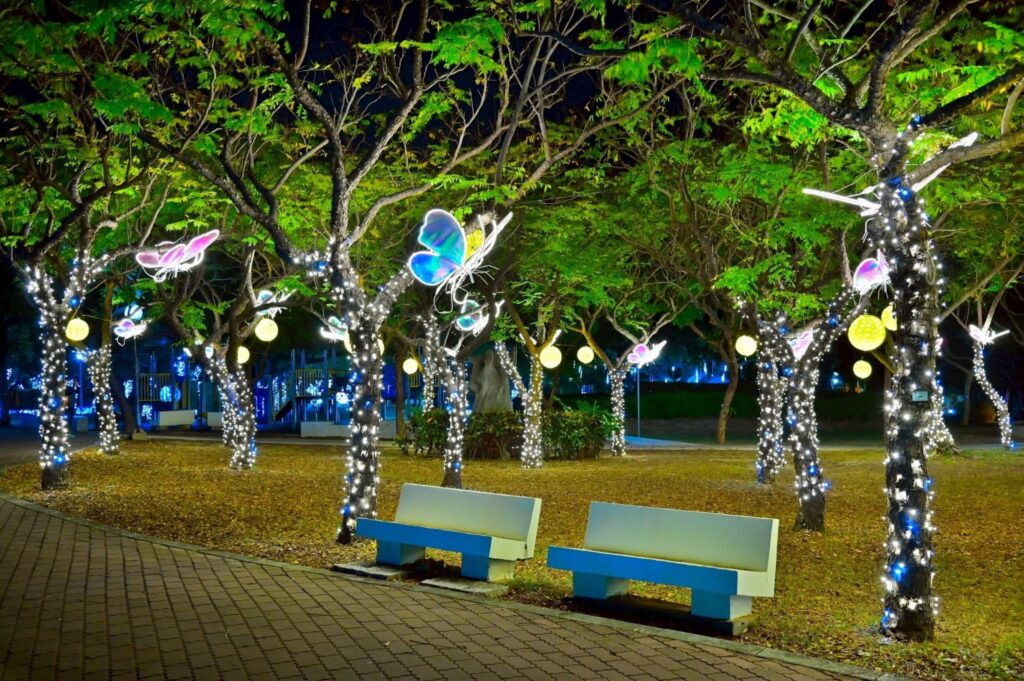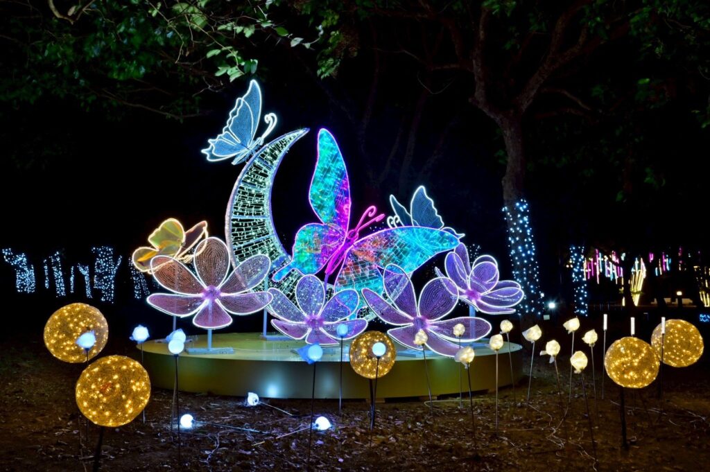 此外,並以聖誕、蝴蝶、月亮與花卉等元素延伸設計,打造「雪漾鈴響谷」、「蝶舞」、「月漾花海」、「稻光嘉禾」、「彩浪山丘」、「雪舞天廊」、「織光之徑」、與象徵幸福的「潤光之心」等亮點展區,增添浪漫繽紛的節慶氛圍。