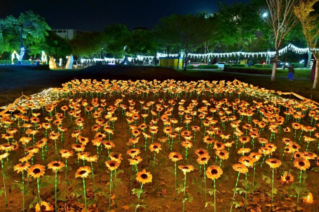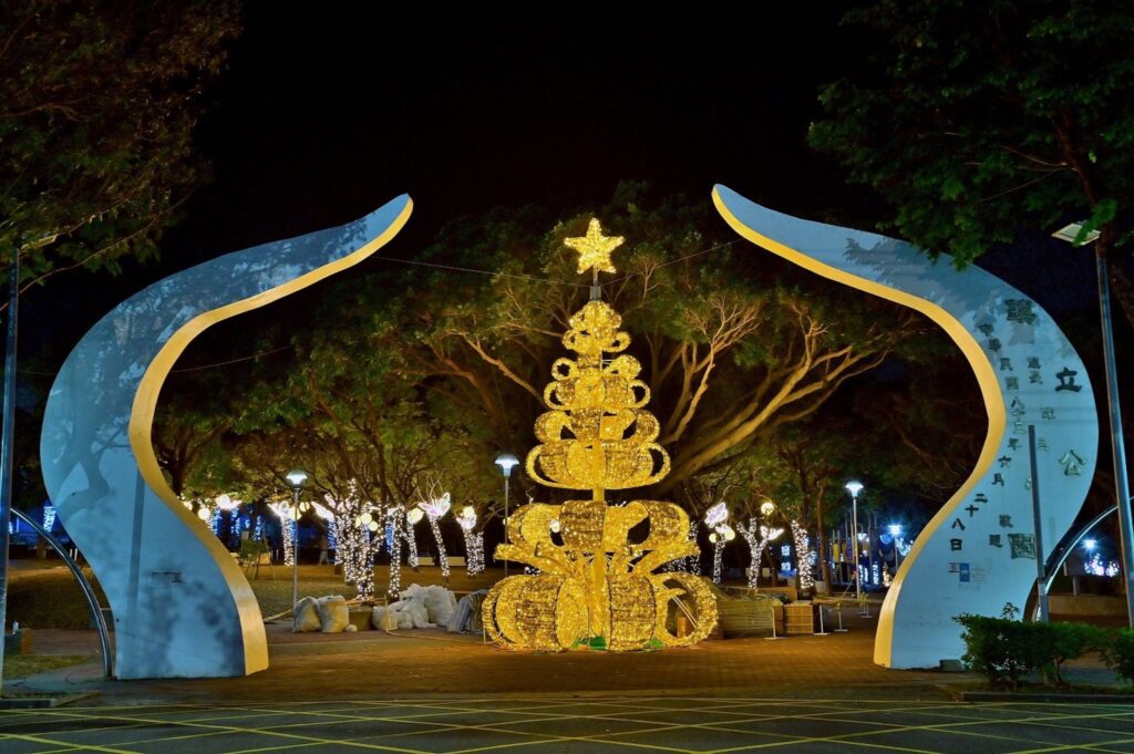 沙鹿區長劉素幸表示,今年燈區以7.5米高主燈「光漾水舞樹」作為迎賓亮點,金黃緞帶結合水舞波紋與律動光束,打造最吸睛的拍照打卡焦點;沿著園區步道,更設置雪花、月影、光瀑布、星光光球等浪漫燈飾,包含「蝶樂光影」、「星泉樹」、「幻光長老」、「光聚琉璃」、「光耀葵田」、「漣漪光影」、「光韻樂徑」等展區,讓遊客漫步其間,彷彿走入冬日童話世界。