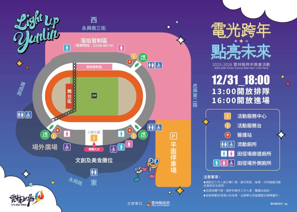 今年晚會規劃周邊市集、景點與農特產品推廣等活動,廣邀民眾共襄盛舉,一起來雲林跨年,晚會場地可容納至少2萬人以上,鄰近高鐵雲林站,極具交通便利性,周邊設有千席汽機車停車場,步行至會場也僅需10分鐘,腹地廣大相當方便,活動自12月31日下午4時後開放場內進場,屆時將實施交通管制,管制路段沿線禁止路邊停車。