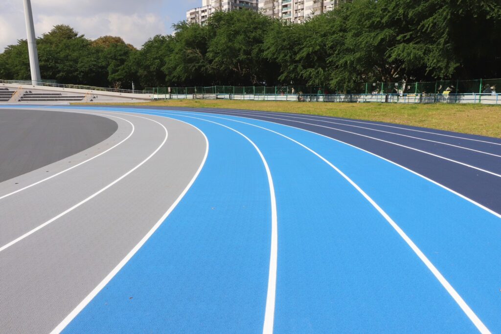 體育局表示,新莊田徑場全年開放,深受市民喜愛,長期承載大量跑者足跡,鋪面因而出現磨損、不規則隆起與外側水溝落差達五公分的情形。本次整修以「安全」與「舒適」為核心,全面更新鋪面並依照田徑協會標準重新劃線,打造煥然一新的三色分道跑道。顏色分區巧妙結合機能與美感,淺灰色為快速道、淺藍色為慢速道、深藍色為緩速道,讓跑者能依自身速度自然分流,視覺延展效果也使場地更明亮寬敞,踏上跑道即可感受細緻而柔韌的質感。