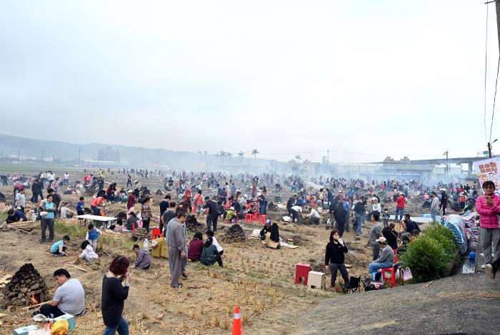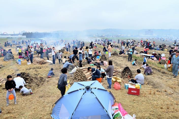 後龍鎮公所連續第10年舉辦甘藷花生節及「焢窯」烤番薯活動,一年比一年盛大,其中一直最受歡迎的「焢窯」,今天共開了700多窯,一早就吸引上千位鄉親走入建興路與新港三路交叉口附近農田,很多人呼朋引伴,有些更是全家總動員,一起享受難得的親子家庭日。
