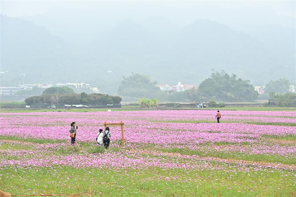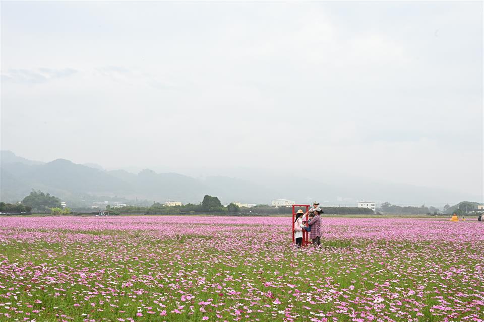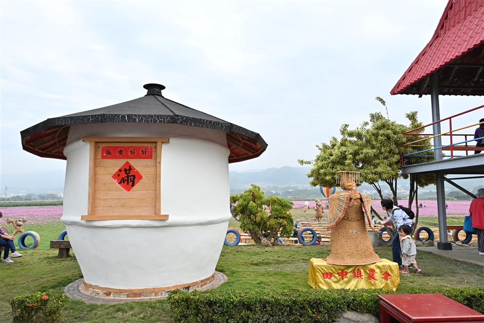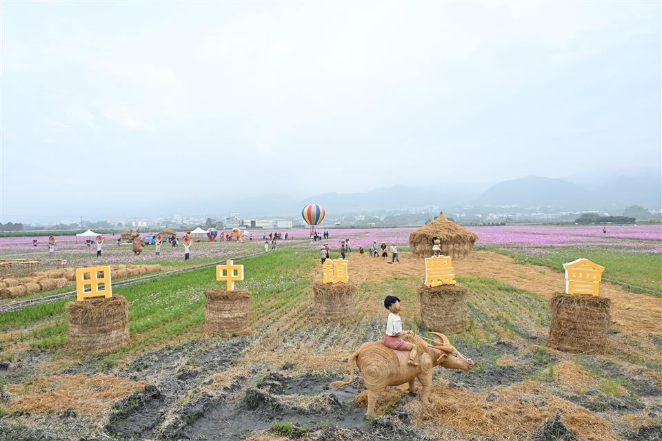 王縣長指出,望高瞭12 公頃的稻田裡種植有澎湃美麗的波斯菊,並於花海中設置可愛的卡通造型稻草人「蠟筆小新」及「小小兵」等多座大型稻草的裝置藝術,善用農業廢棄物的創新思維,藉以推廣在地稻米、蔬果產業,培養在地生產、在地消費的觀念。並邀請農業產銷班、家政班、青年農民展售,現場互動行銷米糧蔬果等,鼓勵鄉親以行動支持在地生產的優質米糧和蔬果。