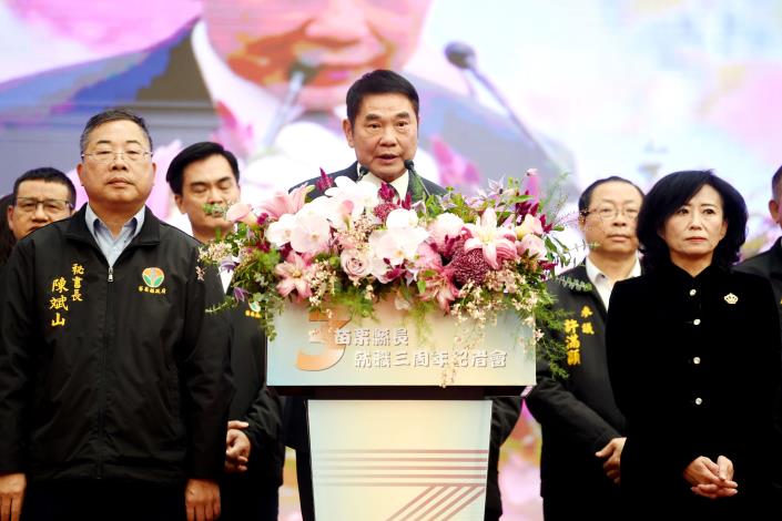 24日縣長就職3周年在苗栗巨蛋體育館盛大舉辦,在苗栗縣原住民族及多元族群文化藝術舞蹈團、新樂舞舞團精采演出下揭開序幕,縣長鍾東錦與夫人陳美琦、女兒鍾可可帶領副縣長邱俐俐、縣府秘書長陳斌山及縣府團隊進場,前縣長徐耀昌、立委陳超明、邱鎮軍、民眾黨苗栗黨部主委賴香伶、副議長張淑芬、各選區議員、鄉鎮市長、代表會主席、農漁會3巨頭、醫院、金融機構、工商企業、機關、勞工、觀光團體、協會等人,共同欣賞施政影片見證縣長上任3年來的施政成果,縣長女兒鍾可可特地從美國飛回來送上一束漂亮花束,為父親打氣加油。