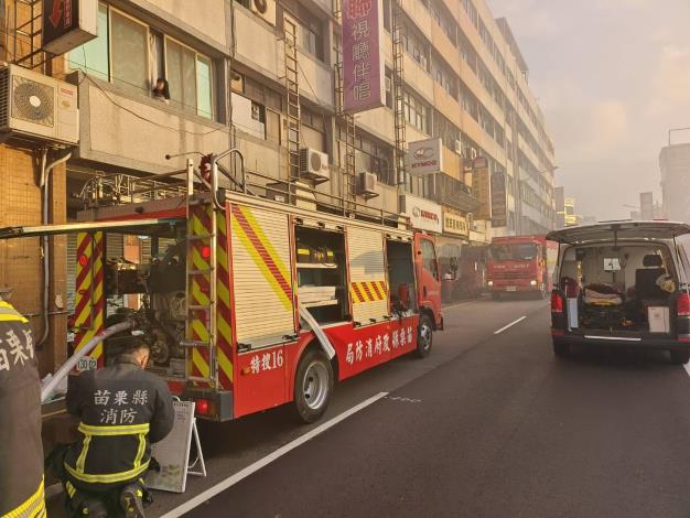 消防人員抵達現場後,立即佈署水線並展開人命搜索,並出動雲梯車實施高處救援,成功救出3名受困民眾;另於屋內搜索時發現1名女性已無生命跡象,隨即送往苗栗醫院救治。經消防人員表示,該名民眾被發現時躲避於廁所內。