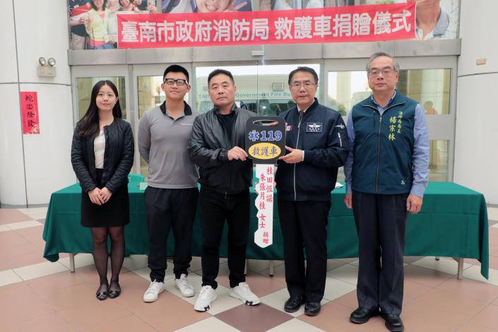 知名企業桂田集團董事長朱仁宗,今(29)日以母親朱張月桂女士名義,捐贈一輛救護車予台南市政府消防局,並配置於鹽水消防隊使用,在市長黃偉哲及消防局長見證下完成捐贈儀式,為地方緊急救護量能再添助力。