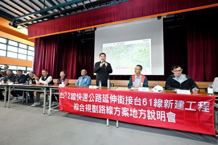 台72線連接台61線西濱道路案,因少數人反對,引發撤案疑慮。公路局為消除鄉親疑慮,今天在後龍鎮公所4樓禮堂舉辦說明會,聽取地方意見,縣長鍾東錦重視此案,上午也親自到場向鄉親說明,並與反對地主當面溝通。鍾縣長表示,地方建設不能鬆懈,但有反對聲音也要尊重,他會持續與反對地主溝通,希望達成共識,讓公路局放心施作,繼續完成台72線最後一哩路。