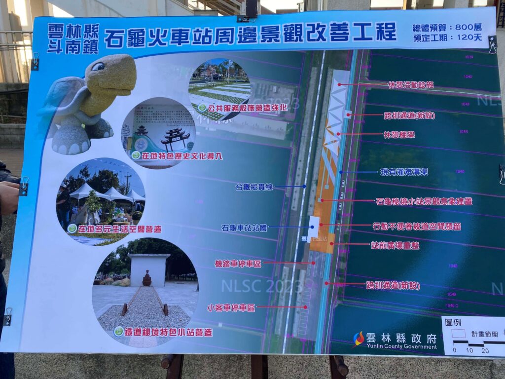 張麗善縣長表示,本工程經費計800萬,接續將進行細部規劃設計、發包及施工,不僅要重整斗南石龜車站周邊景觀,更期能串聯在地生活,凝聚在地鄉親情感,建置「石龜秘境小站」景觀意象,打造成為在地印象深刻的重要地標,提升石龜休憩與觀光發展,也為斗南鎮注入新的活力。