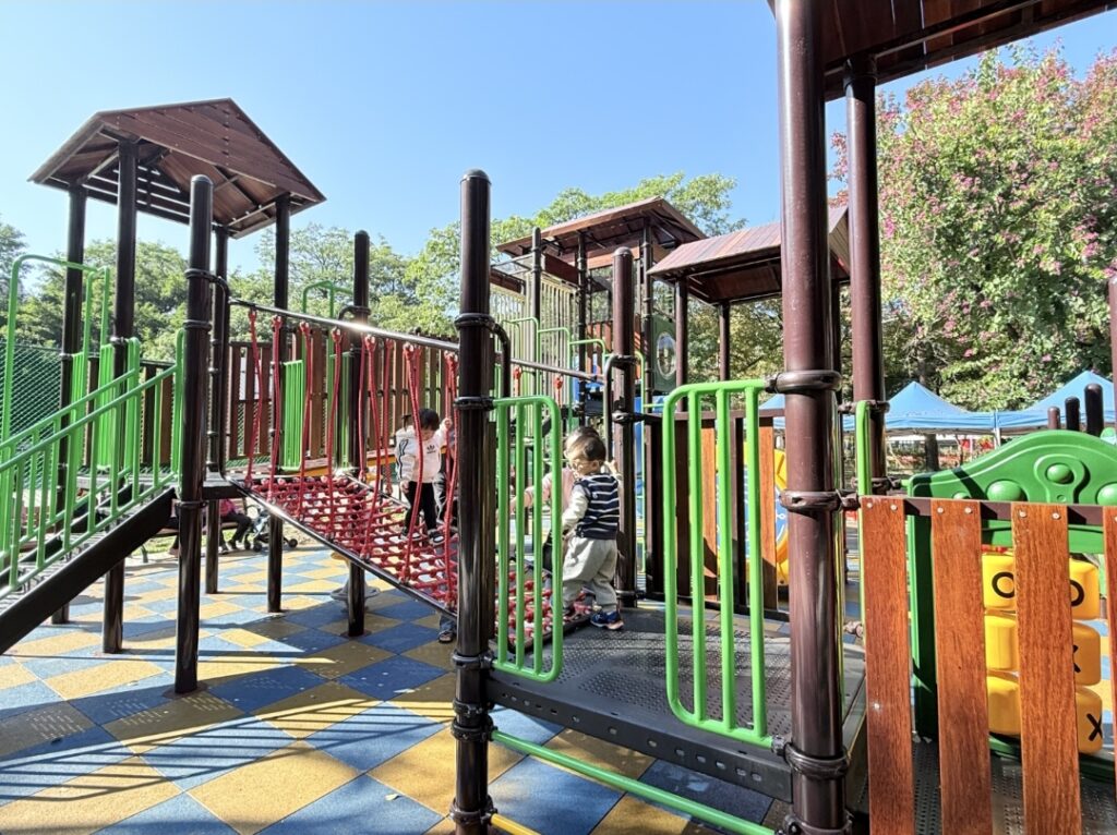 公園內設置全新的大型複合式遊具,主體採用吸睛的藍色系設計,包含一座刺激的旋轉管狀滑梯與一座適合幼齡的開放式滑梯。遊具設計融合了攀爬網、攀岩塊、獨木橋及互動遊戲板等多元元素,能有效訓練孩童的抓握力、平衡感與肢體協調能力,落實「寓教於樂」的設計理念。此外,全區鋪設嶄新的藍黃相間安全彈性地墊,大幅提升緩衝保護,讓家長在陪伴孩子挑戰各項關卡時更加安心。