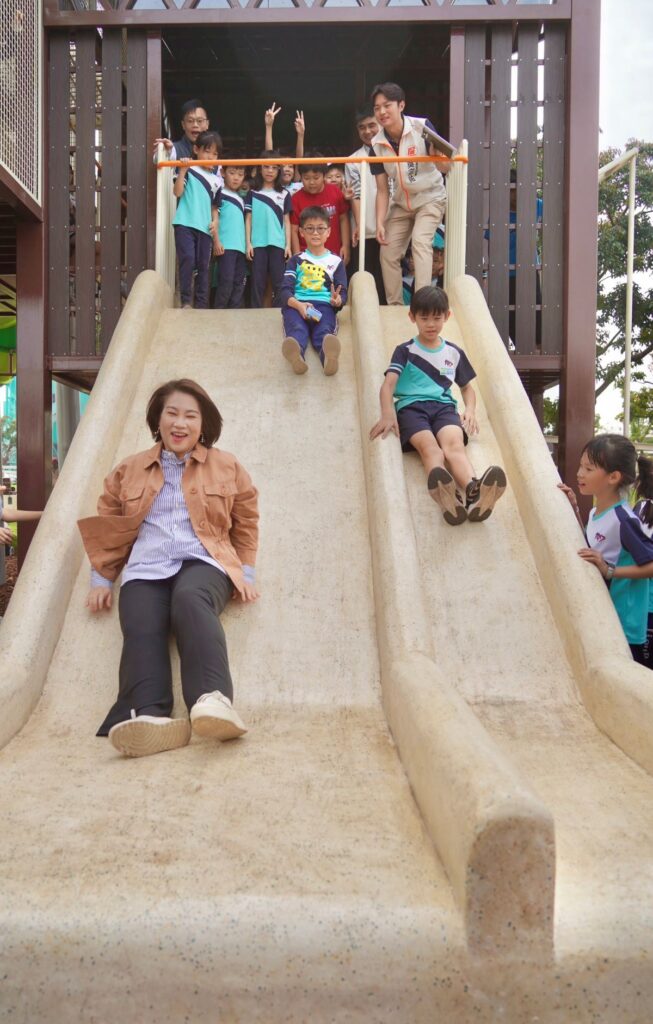 17日一早,周縣長與家長、孩子們一同開箱三座不同難易度的主題遊戲設施,更童心大發地陪孩童玩起溜滑梯,看見小朋友們臉上洋溢著燦爛笑容、玩得不亦樂乎,也讓周縣長感到相當欣慰,她說,屏東在推動共融遊戲場的路上始終走在最前端,期盼透過共融遊戲場的啟用,讓更多孩子在歡笑聲中快樂成長。