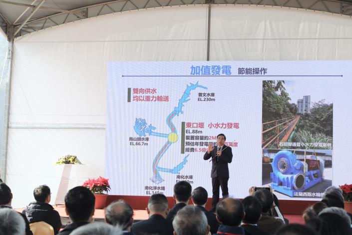水利局說明,曾文南化聯通管工程為行政院於107年核定之重大水利建設,納入前瞻基礎建設計畫推動,計畫期程自108年至114年,總經費約133億元,工程建置曾文水庫至南化淨水場間約25公里輸水管線,並設計雙向供水系統,最大每日輸水量可達80萬噸,可有效串聯曾文水庫、烏山頭水庫、南化水庫及高屏堰水系,建立南部區域水源互補與備援機制。另該工程充分利用水庫間高程差,採重力輸水方式進行雙向調度,不需額外動力即可完成輸水作業,兼顧節能與效率,並具備加值發電潛力,其相關設施亦可結合小水力發電系統,提升水資源使用附加價值,展現永續水利建設成果。
