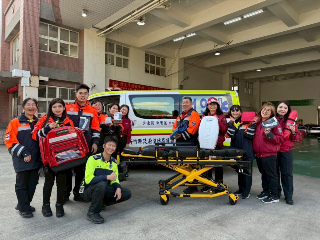 新竹縣竹北市西區緊急醫療能量再升級!在地企業尚崎工程公司董事長謝東毅、陳宥芸伉儷,為回饋鄉里並關懷公共安全,慷慨捐贈新竹縣政府消防局一輛總價值近450萬元的頂級救護車。捐贈儀式23日上午在豐田分隊舉行,由新竹縣副縣長陳見賢代表受贈,並對謝董事長賢伉儷的無私善舉致上最誠摯的謝意。