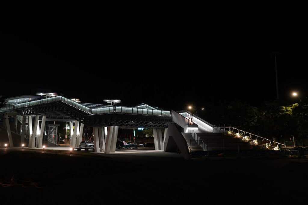 陳百慶科長說明,南港立體連通平臺工程還提供安全且兼具美學的步行空間;在夜間照明部分,兼具功能性與視覺美感,以光線引導民眾通行,提升夜間環境的安全感,以「人本步行」與「東區綠廊串聯」為核心理念,在橋體內部、階梯與平臺等處採用嵌入式或隱藏式燈具,並在欄杆與邊緣運用間接打光技術,有效控制眩光與光害,大幅提升使用者夜間通行的舒適度與安全性。