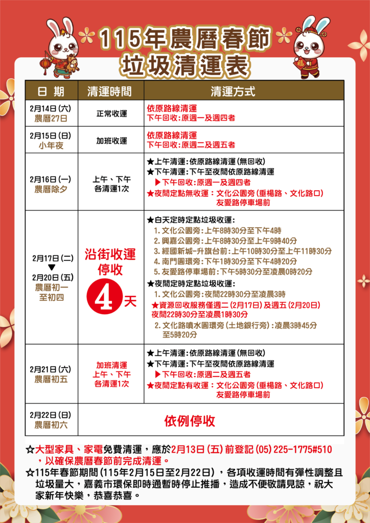嘉義市政府環境保護局公布春節垃圾清運日程,2月17日(農曆初一)至2月20日(農曆初四)沿街收運共4天停收,僅提供7處定時定點垃圾收運點;2月15日小年夜加班收運;2月16日除夕當天上午及下午,各清運1次,夜間定點無收運;2月21日初五當天上午及下午,各清運1次;2月23日初七起恢復正常收運。提醒春節前夕垃圾量多,垃圾車收運時間依當日實際情形為準! 呼籲市民多加利用「愛嘉義」APP或「嘉義市環保即時通」APP,可即時查詢垃圾車動態,請務必將垃圾分類、廚餘瀝乾與妥善打包,再交由垃圾車及資源回收車收運。