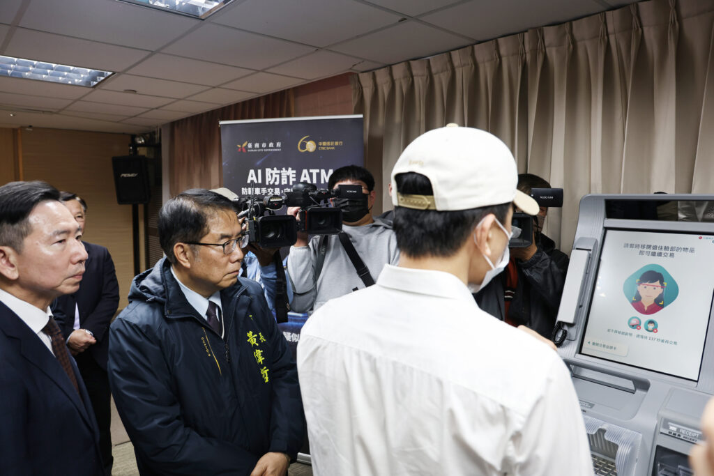 台南市政府前年首開全國先例,與金融機構合作試辦防詐ATM,成效相當亮眼。今(26)日於永華市政中心舉行記者會,宣布再與中國信託商業銀行擴大合作,於市內佈建AI防詐ATM系統,建立即時預警與聯防機制以強化防詐網絡,守護市民財產安全。記者會中並展示AI防詐提款機示範使用,未來如有疑似車手戴口罩提領,除將發出警示音提醒,也將自動通報警方到場。