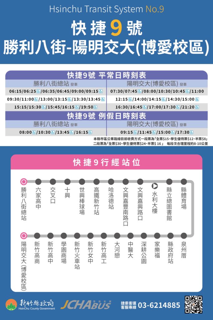 為增進大新竹生活圈往返便利性,快捷9號自115年2月1日起新增假日班表,共8班次,分別為往程(勝利八街總站發車)4班次:08:00、10:30、13:45、16:15;返程(陽明交大博愛校區發車)4班次:09:15、11:45、15:00、17:30。增班照顧假日觀光遊憩、親子出遊及學生往返新竹市區補習之需求,增進高鐵新竹站與新竹火車站之轉乘功能,以利各使用族群搭乘需求。