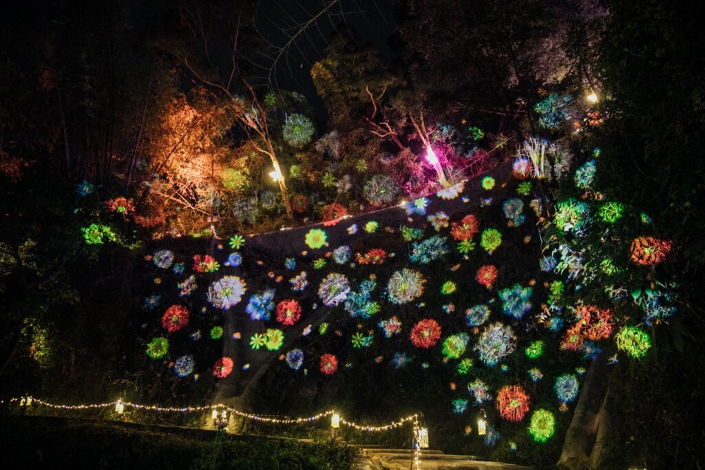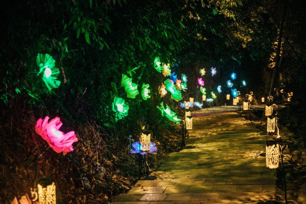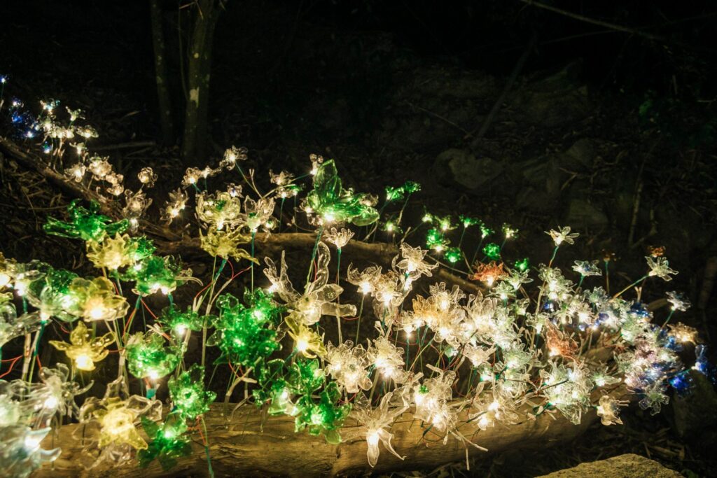 「夜綻之花」模擬峭壁間盛開的花朵,夜晚花蕊亮起後,民眾可輕觸花蕊,變換整串花朵的光影色彩,增添互動趣味;「蝶舞山林」取材大津周邊蝴蝶生態,蝴蝶燈飾沿山道佈置,部份還有動態開闔效果,營造蝴蝶飛舞意象;「文心蘭林」以文心蘭為主題,結合結構裝置與花藝設計,打造可供民眾穿梭其中的花林景觀;「花果天堂」則融合在地植物與水果意象,透過投影與螢光元素,打造必拍的沉浸式光影場景。