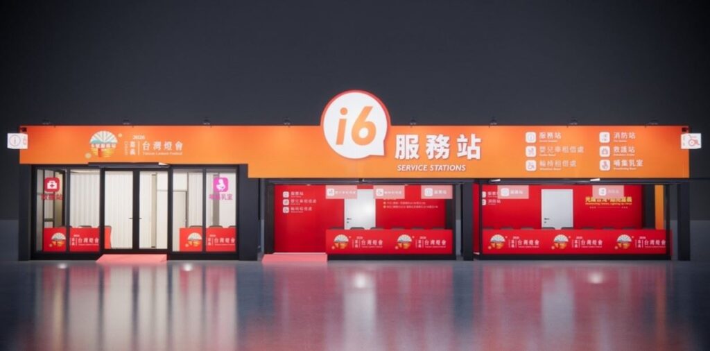 服務站整合哺集乳室、救護站、機動派出所及消防站等功能,提供燈區諮詢、動線指引與緊急救護服務,另提供免費衛生棉,供臨時有需要的民眾取用;各服務站提供輪椅及嬰兒車租借服務,民眾出示證件並透過手機掃描QR Code即可快速完成借用申請。