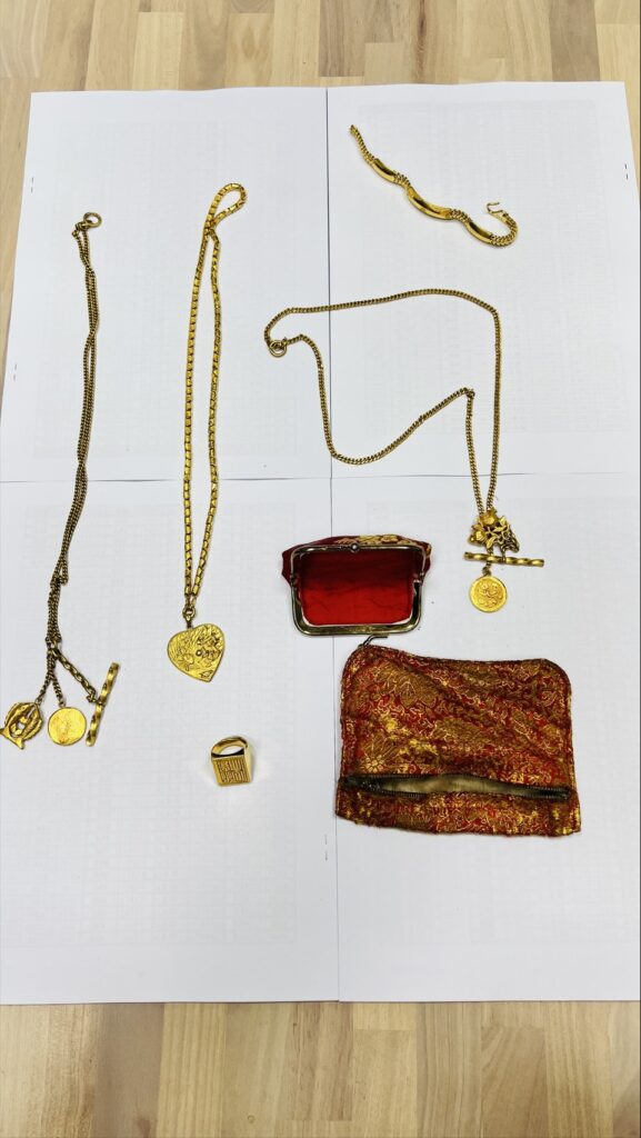 環保局說明,昨日瑞芳區清潔隊機動班隊員胡敏男、蔡憲朋及林秉鴻在執行大型家具預約收運的任務時,依作業流程逐一抽出抽屜檢查,以確保作業安全及民眾有無將貴重物品遺漏。檢視至最下層抽屜時,發現兩件掉落之紅色小包,打開後赫然發現內有金項鍊3條、金手鍊1條以及金戒指1枚。由於近期國際金價處於歷史新高,金飾經秤重合計達7.765兩,換算市值約140萬元。