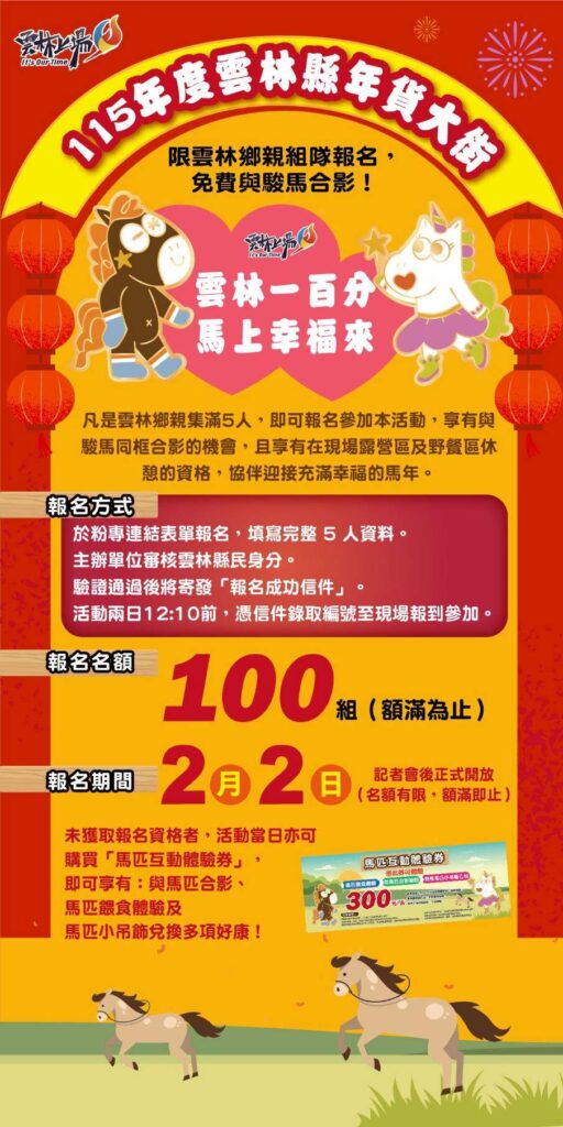 廖處長指出,今年亦首度推出雲林縣民專屬的「雲林一百分,馬上幸福來」免費與駿馬合影活動,只要5人組隊報名,即可免費與駿馬同框合影,留下專屬於家人與親友的幸福紀念照,報名(至『115年度雲林縣年貨大街展售活動』粉專連結表單報名)於今日記者會後正式開放,限量名額,額滿為止。此外,活動首日現場還安排書法大師揮毫春聯免費贈送,以及限時搶購活動,讓大家以優惠價格購得優質商品。誠摯邀請全台民眾於2月7日、8日來到斗南,走進雲林年貨大街,辦年貨、吃美食、拚好運、照幸福,一起迎接熱鬧喜氣的新年。
