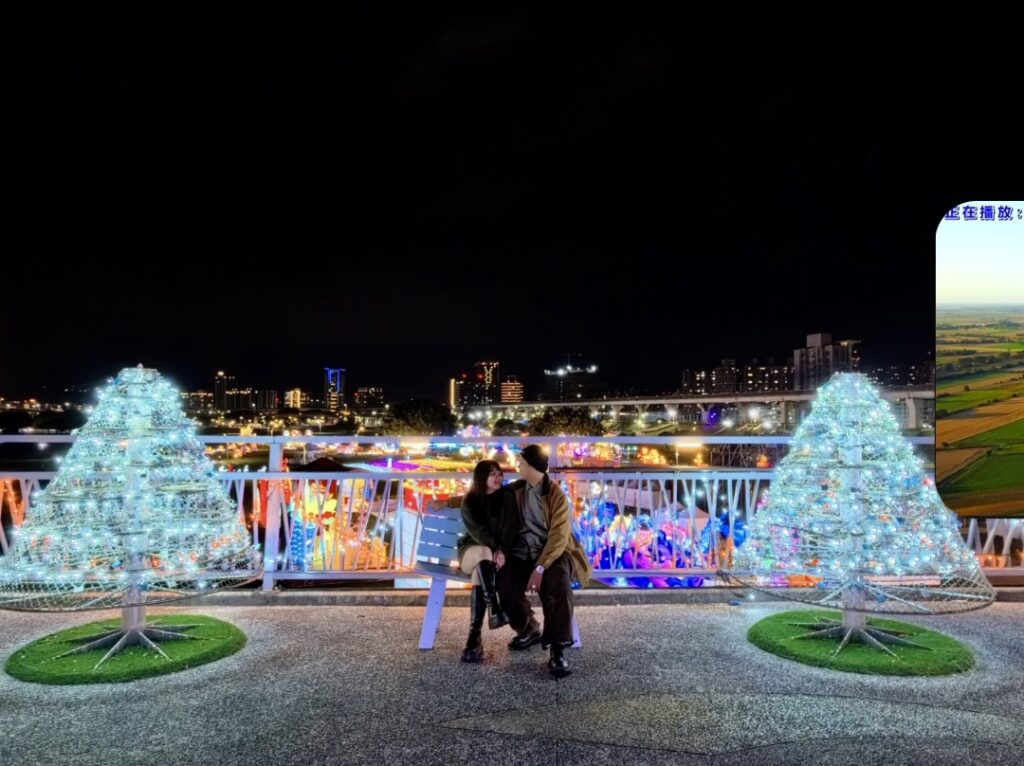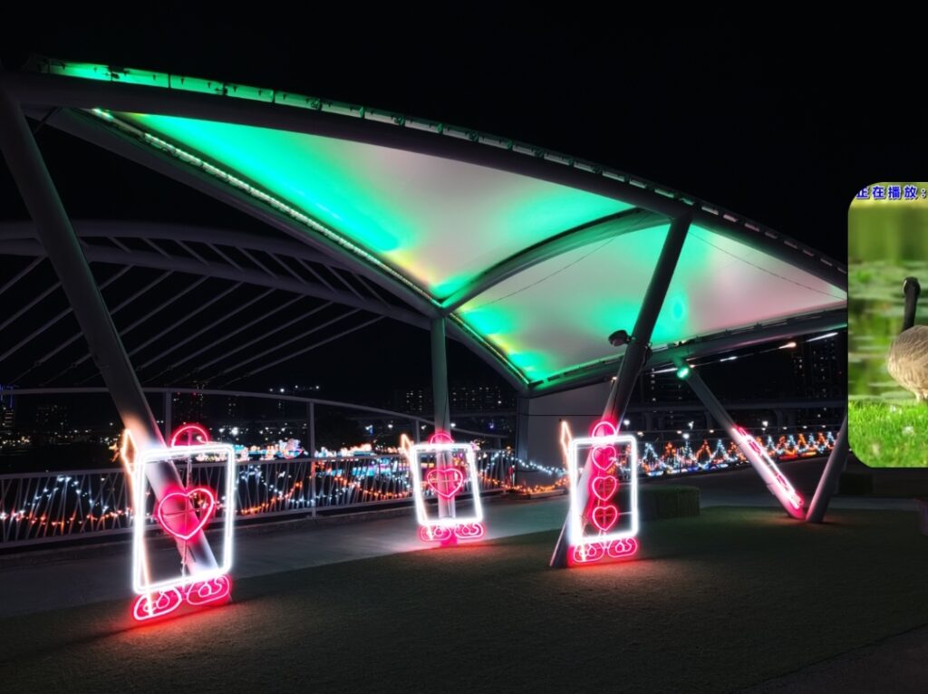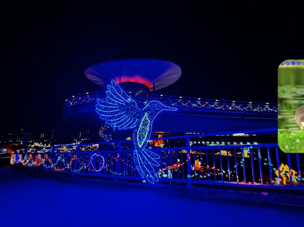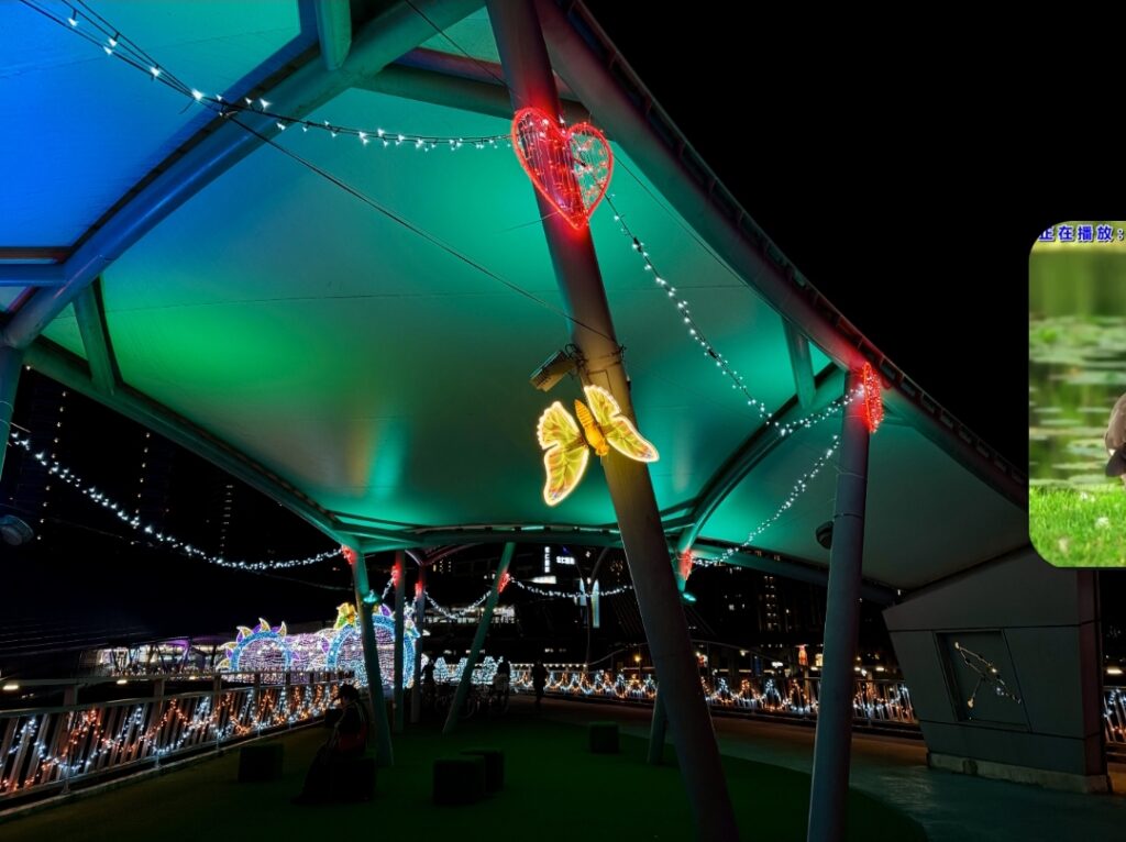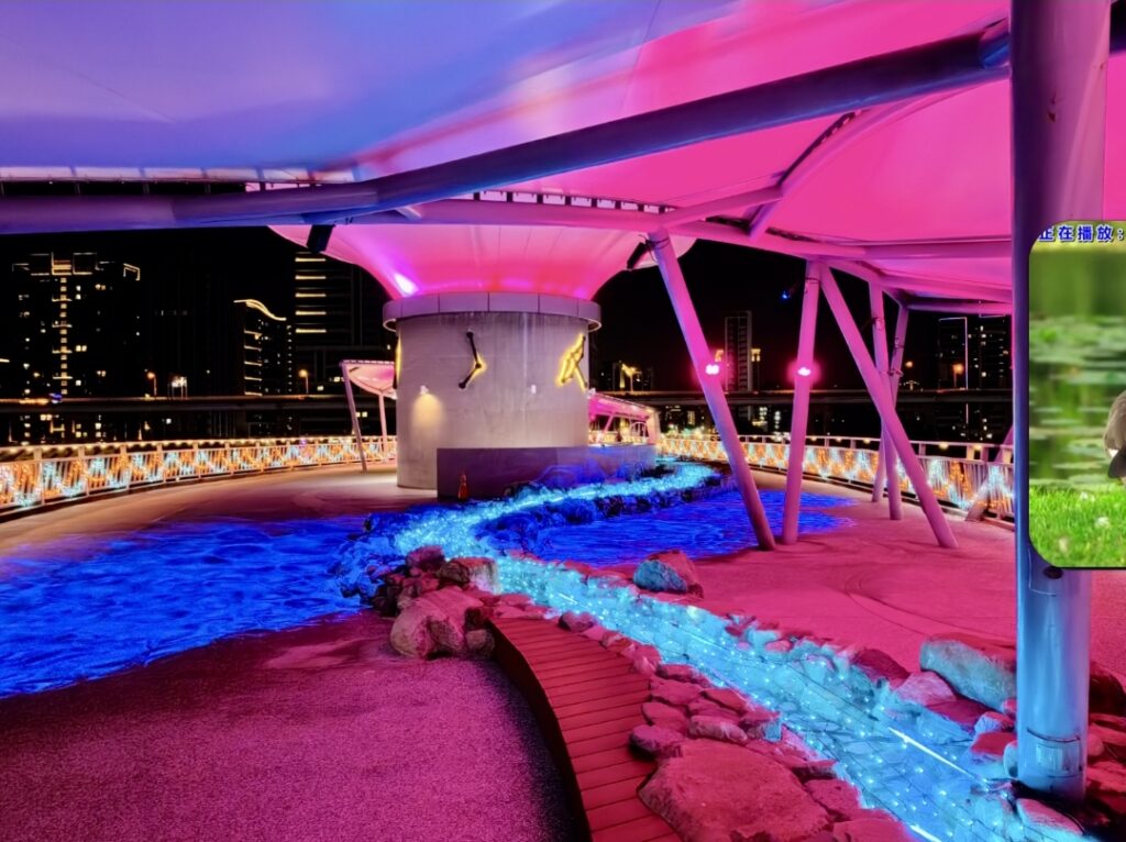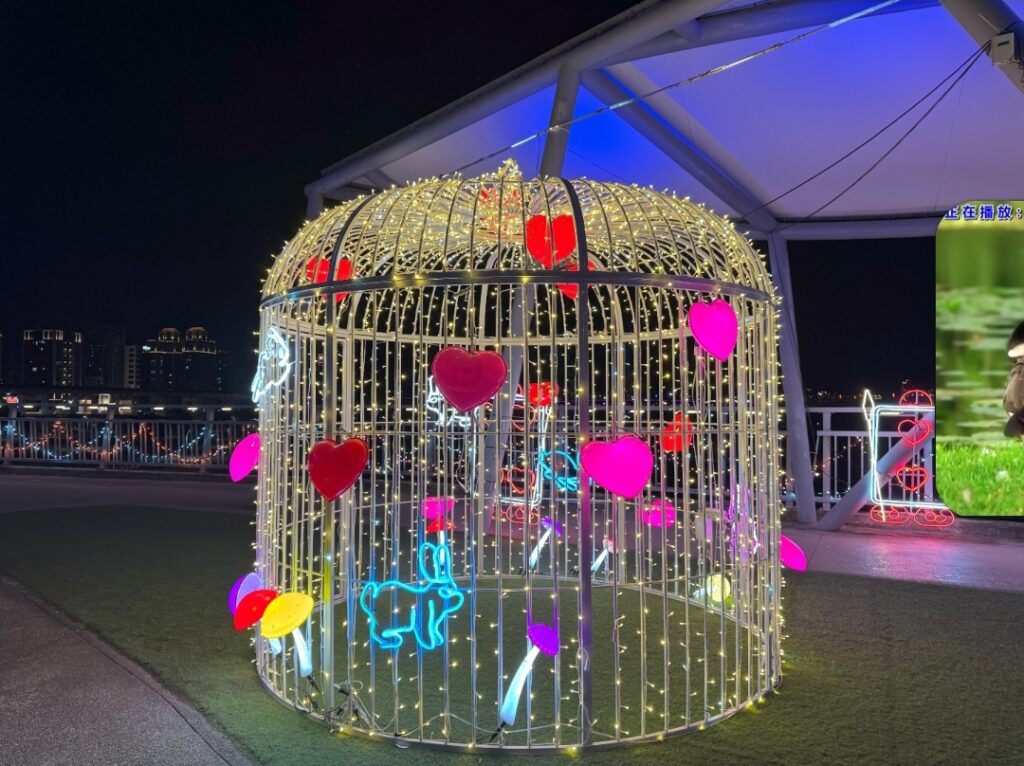走上辰光橋,光雕主題之一「星戀步橋」以水波紋燈光鋪陳橋面,光影隨腳步流動,如月色輕灑河面,搭配白光與珊瑚橘星星燈串,營造滿滿儀式感;延伸至「星戀草坪座」,柔和燈串搭配飛舞的蝴蝶、蜻蜓燈飾,將成為情侶拍照、親子停留的夢幻打卡點。