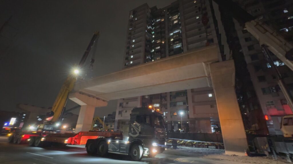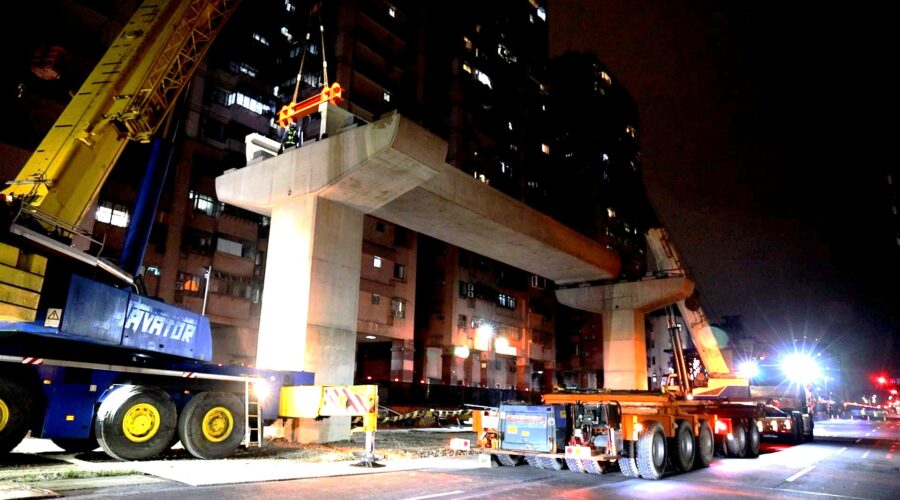 捷運局長李政安進一步指出,為了將交通影響降至最低,規劃夜間吊裝施作,施工團隊展開與時間賽跑的精密作戰,從晚間10點封路至隔天清晨6點,短短8個小時內,必須先完成風速量測、一機三證、吊車檢查等等嚴謹的前置作業後,再進行預鑄梁起吊作業,凌晨6點天快亮之前,就得讓道路恢復順暢,確保市民通勤不受影響。單一夜間最多可吊裝6支預鑄梁,每一支梁的升空,都代表我們離便利的捷運生活又跨進了一步,特別感謝周圍居民的包容與配合,讓工程能順利進行。