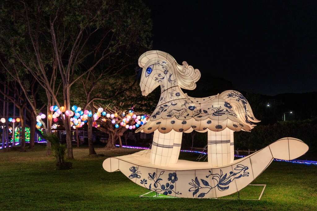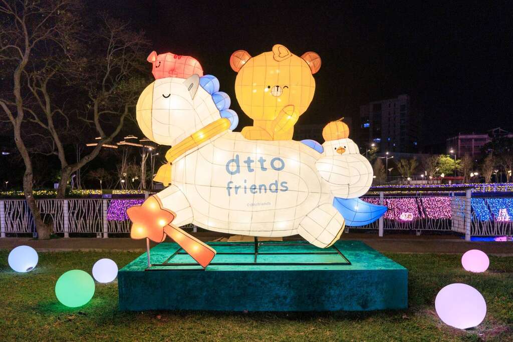 冒險終點來到三民運動公園,由 Dcard 人氣 IP dtto friends 坐鎮!腸太郎、狗狗和好鴨等角色換上馬年限定裝扮,並融入吃元宵、放天燈等傳統元素,是今年最夯的社群打卡熱點。在童趣氛圍中,農業局特別打造的「馬力食足」燈組同樣吸睛,以勤勉的馬兒結合桃園在地農特產意象,傳遞「馬到成功、食在滿足」的豐收喜悅。