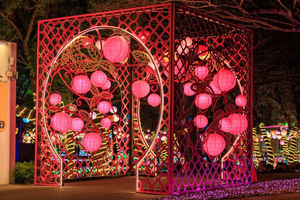抵達燈會,首波亮點便是兩座象徵幸福入口的迎賓門。「桃花朵朵開」以桃園市花為靈感,巨大的粉嫩花瓣層層堆疊,結合律動光影,走入其中彷彿漫步於盛開的花海隧道,是情侶與網美必拍的首選。而「桃囍臨門」則揉合傳統「囍」字文化與時尚線條,粉潤桃子燈芒象徵馬年福氣,更特別的是現場還散發淡淡的水蜜桃芳香,讓遊客一進門就從視覺與嗅覺感受到滿滿祝福。