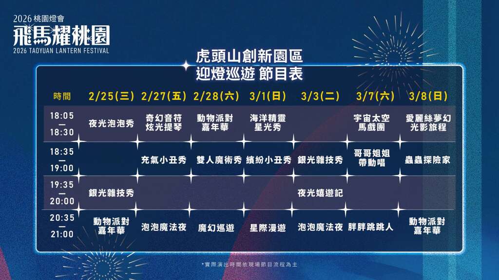桃園年度視覺盛宴「2026桃園燈會—飛馬耀桃園」,即將於 2 月 25 日至 3 月 8 日閃耀登場!為期 12 天的燈會橫跨「虎頭山創新園區」、「南崁溪水岸」及「三民運動公園」三大場域,分別打造「未來光域」、「森韻流域」與「dtto friends 樂園」。今年不僅有全台首座機械動態飛馬主燈,更導入遊樂園等級的巡遊展演與科技互動,邀請民眾共赴這場光影嘉年華。