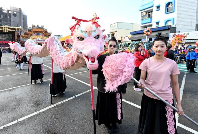 由苗栗縣各社團所組成的15隊舞龍陣頭,今天上午齊聚在玉清宮前廣場舉行開光點睛儀式,現場祥龍一字排開,聲勢浩大。其中,來自三義鄉「舞空術劇團」的祥龍Luna,粉紅色龍身加上可愛妝扮,相當吸睛,尤其龍隊成員由國小到大學生組成,也讓人看見火旁龍文化世代傳承、薪火不息的文化力量。