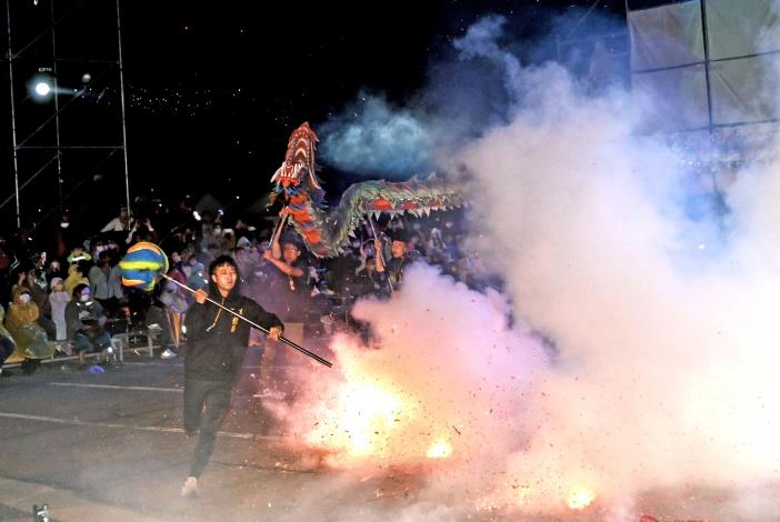 晚間的火旁龍之夜由兩廣阿貴師國術醒獅團開場,參與炸龍的隊伍隨後接續進場。為了讓民眾更具參與感,公所也特別規劃「火旁龍體驗區」,準備手套、耳塞、護目鏡,讓在場的民眾除了視覺及聽覺上感受火旁龍的震撼。