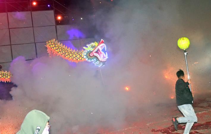 苗栗火旁龍系列活動28日晚間在後龍溪河濱公園進行壓軸「火旁龍之夜」,現場參與龍隊依序進場,接受鞭炮瘋狂轟炸,煙硝火光瀰漫整個河濱公園,持續一整晚。