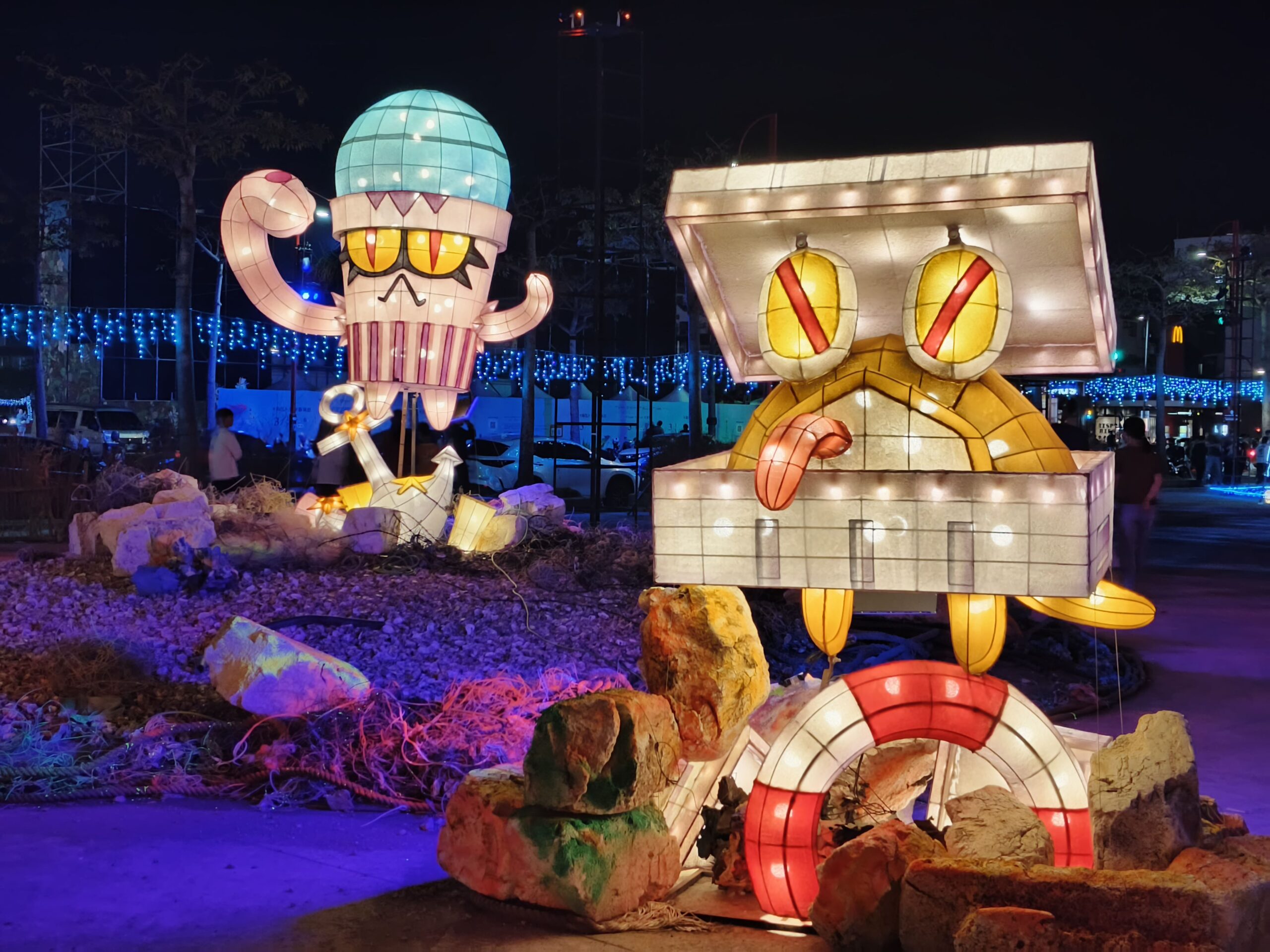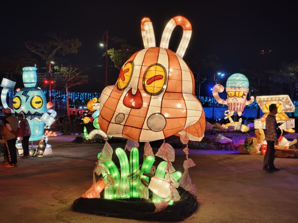 象徵智慧、強大、溫柔、堅定的力量,鯨魚戰艦堅強守護海洋,華麗的燈光雷射特效,沉浸式的海洋音效,聲光效果十足,燈會期間每天晚上6:15-9:45,每30分鐘一場的主燈秀,光彩奪目、絢麗璀璨,超吸睛。