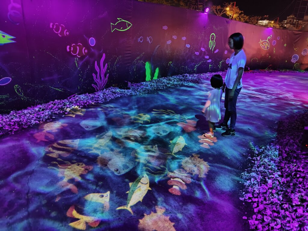 展區內除了大量的海洋生物燈飾之外,還可以看到地上好多彩色的小魚兒在腳下穿梭游來游去,非常有沉浸感。海底隧道不定時噴出的泡泡,更是讓小朋友超級興奮。
