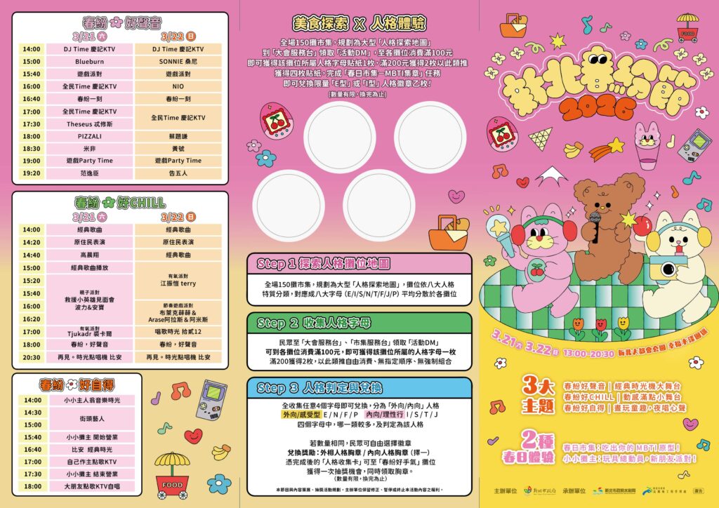 「MBTI 春日市集」則以美食體驗形塑人格,全台首創將 150 個品牌攤位按八大人格特質分類,化身為超大型人格探索地圖,消費滿 100 元可獲得該攤位所屬人格字母一枚,集齊任四個字母即可前往「春紛好手氣」攤位參與驚喜抽獎,並領取「 E 人 / I 人專屬胸章」,讓春天的探索更加有趣。去年大受好評的「春紛老饕套餐組合」,今年也將以「人格探索」為主題設計,邀請三重名店「Hold 食雞」與「新北市三峽農會」強強聯手炸雞品茗饗宴,外向 E 人推薦搭配層次明亮「嚴選碧螺春」,內向 I 人則適合溫潤甜香的「精選蜜香紅茶」,這個春天,就用味蕾來場人格鑑定。