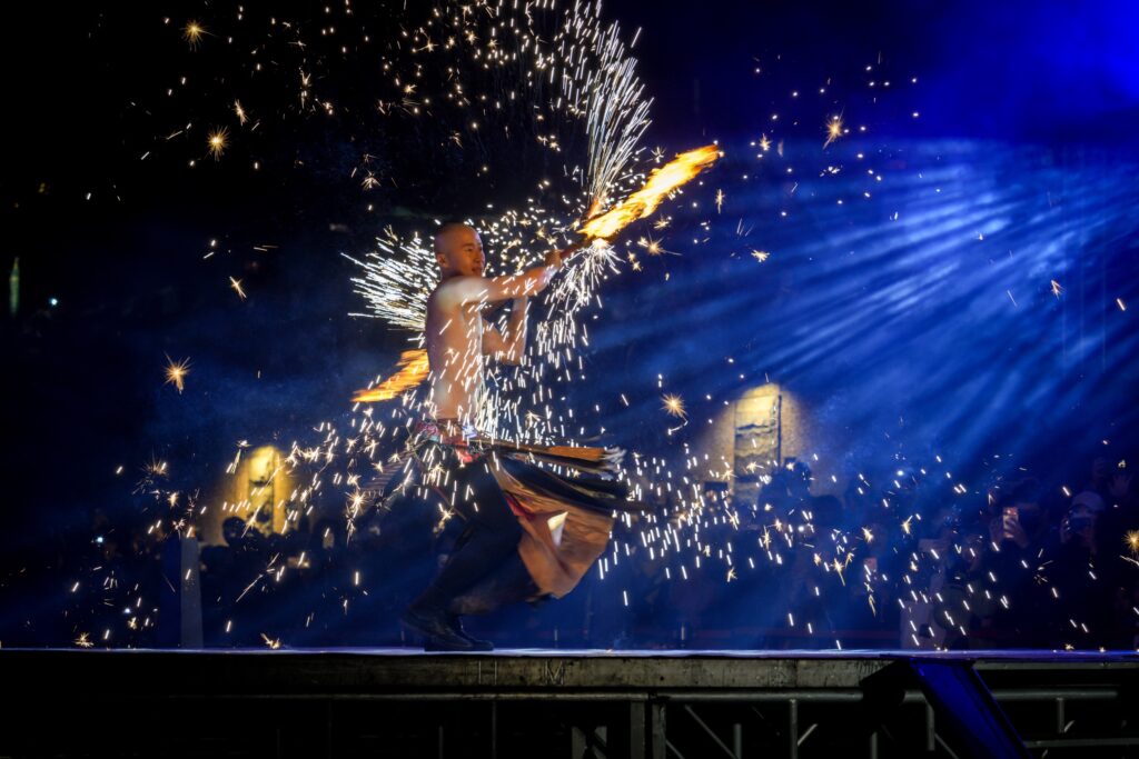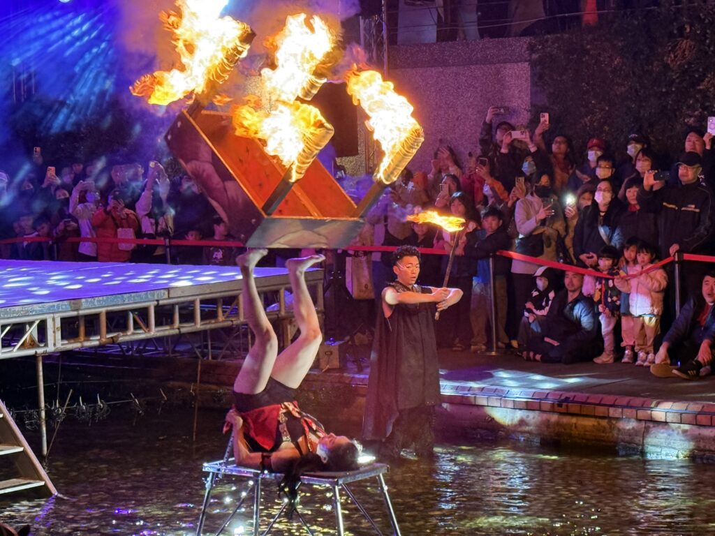 今晚開幕典禮由「即將成真火舞團」精彩擔綱,團員楊立微曾登上英國大型選秀舞台,以精湛足技與獨創火桌秀驚豔全球。團隊特別獻上 15 分鐘限定作品《馬祥厚運,火耀新北》,表演者「以烈火神劍為筆、中港水域為紙」,透過高難度劍舞轉動,將力與美融合為一,具象化地為市民「轉動厚運」。赤紅火光與河岸光影交織,熾熱火焰穿梭於夢幻燈海間,呈現水火交融的視覺震撼,華麗揭開光雕展序幕。