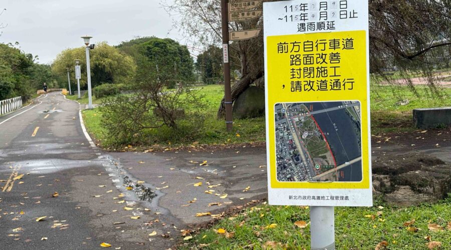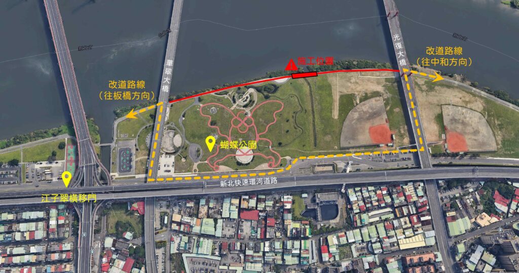新北市政府高灘地工程管理處為改善新北市河濱江子翠自行車道並提升騎乘品質,即日起至115年4月7日(遇雨順延)進行江子翠自行車道(鄰板橋蝴蝶公園)鋪面改善工程,施工期間請民眾配合改道通行,以維護民眾安全及工程順利進行。