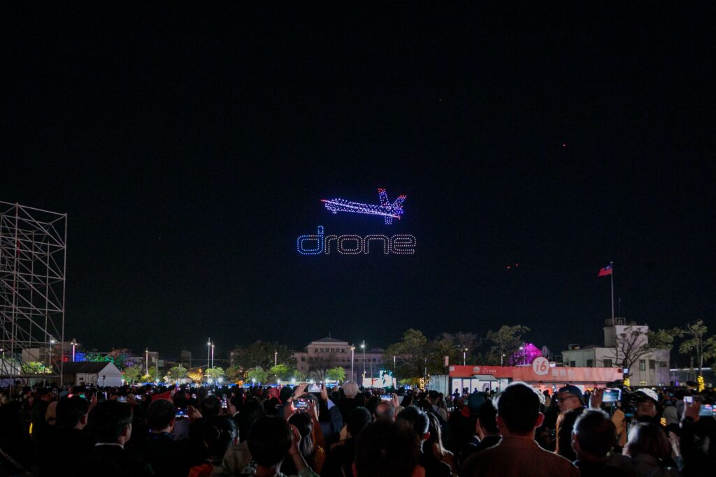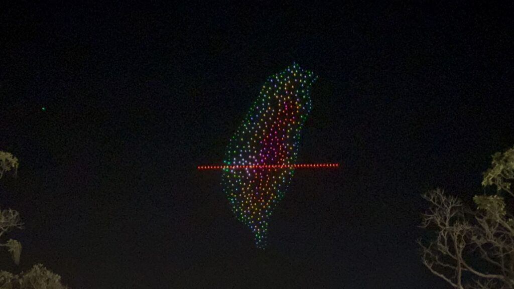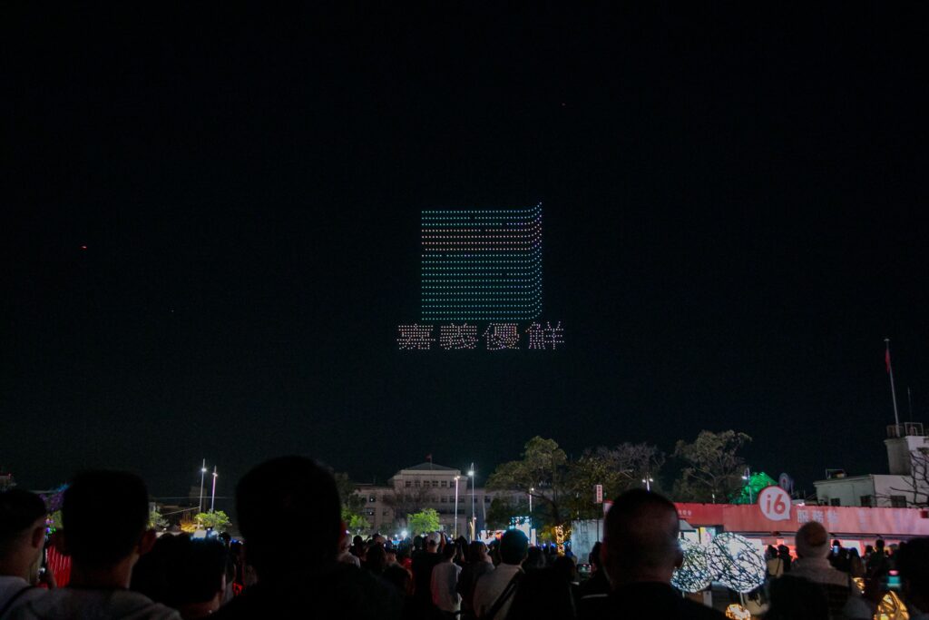接著,夜空中浮現「嘉義優鮮」品牌標誌,代表嘉義優質農產與在地農業實力,展現嘉義從土地出發、以農業為根基的深厚底蘊;接續登場的「騰雲無人機」展現台灣自主研發的大型無人機成果,也凸顯嘉義作為無人機產業重要基地的角色。