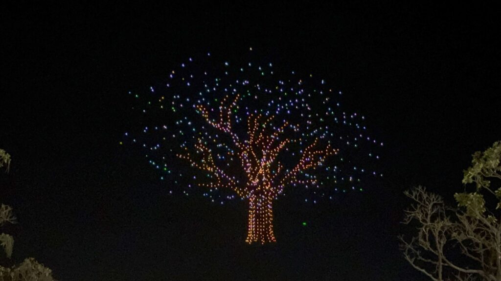 展演後段,無人機群組成一棵向上生長的大樹,表示嘉義從土地出發、持續茁壯的發展力量,結尾呈現「2026台灣燈會在嘉義」主視覺,中央字樣化為「黃金十年」,嘉義正邁向產業升級與城市發展的嶄新階段。