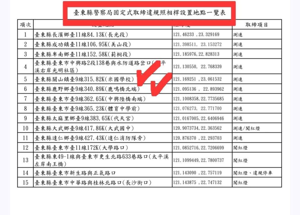為維護道路交通安全並降低交通事故發生率,臺東縣警察局關山分局表示,轄內臺9線340.89公里處(鹿野鄉鹿鳴橋北端)新設置之固定式測速照相設備,已於本(3)月正式啟用執法,提醒行經該路段之駕駛人務必依規定60公里/小時速限行駛,以維護行車安全並避免違規受罰。