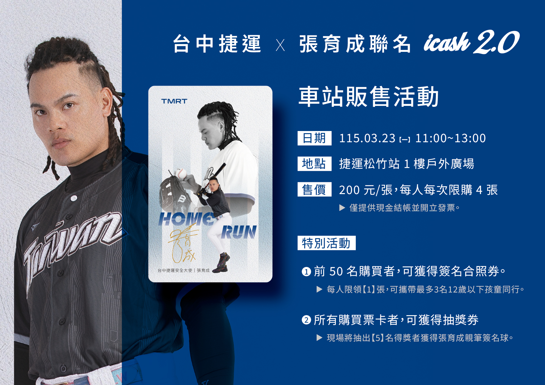 台中捷運邀請球迷朋友準備好滿滿的棒球熱情,3月23日一起搭乘捷運前往松竹站,親自感受「國防部長」張育成的魅力,並共同見證他與台中捷運攜手守護捷運安全的重要時刻。