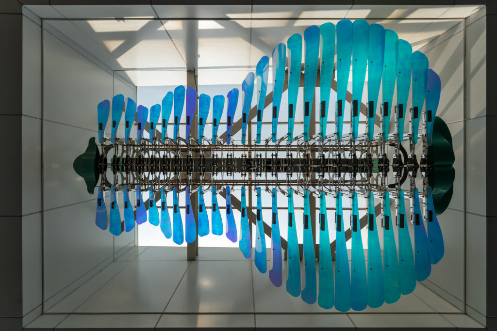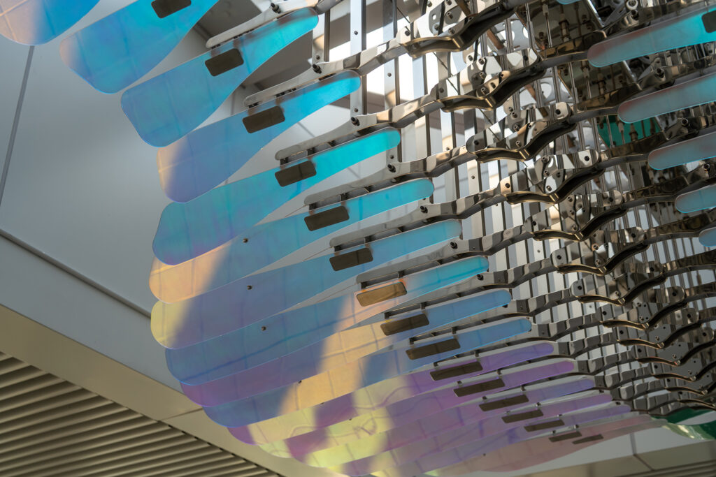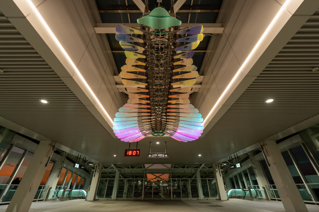 此外,作品由上千個零組件精密構成,透過馬達驅動,使片狀結構在空中微幅擺動,形成層層律動的動態效果。中捷指出,每日6時至24時,於整點及30分啟動動態展演,每次約15分鐘,片狀結構緩緩擺動,營造流動光影的節奏感,彷彿在空間中緩慢呼吸,成為烏日站獨特的藝術風景。